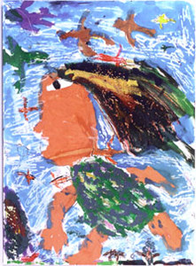 | 三コが、オンチャたちに、作った山が、火じになってしまって、ぼくは、とてもしんぱいになりました。三コも、とてもしんぱいだったと思いました。それで、山をこえて、鳥とぶつかりながら、いっしょうけんめいに走っていきました。それなのに、山は、もえてしまいました。ふもとの山をまもるために、オイダラ山に、とびこんだ「三コは、ゆうきがあるとおもいました。