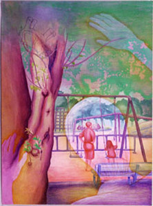 | 今年は受験。でもまだ「こうしたい」という将来の希望がなく、流れるままの自分がいた。またこの本にも私と同じ思いのみさきとおじいちゃんがいた。私はそんな二人が見つけた、生きがいの大切さを淡い表現の中で描こうとした。特に生きがいの発見となった、みさきとおじいちゃんの大切な時間を、私の大好きな公園の中に描きたいと思った。私にとってローバのような心の支えは現れるのだろうか。高校生になってそんな生きがいを見つけたい。 |