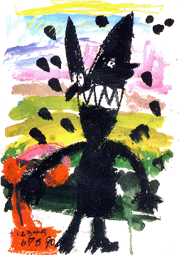 | ぼくは、このおはなしのなかで、こどものおおかみがでんわからでてくるところがおもしろかったです。おとこのことおおかみがなかよくなったので、よかったなあとおもいました。おおかみのかおがじょうずにかけたとおもいます。でんわから、とつぜんでてきたのをあらわすために、バックのいろをかえてぬ りました。くろのてんをつけて、おおかみがびっくりしたようすもかけました。 |