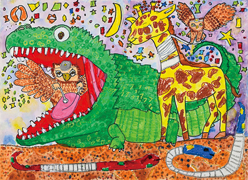 オリバーくんが、おいしゃさんになったらどんなかんじゃさんがくるのかなと、そうぞうしてかきました。わにのはも、きりんのくびも、へびのからだもちりょうします。フクロウなので、きっと夜でもちりょうすると思ってかきました。