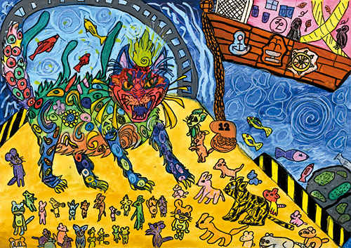 私は、G氏が必死にねずみたちと戦っているところをテーマにかきました。G氏は最終的にエサを守れなくて社長がふきげんになってしまったけどG氏は必死に守ったんだよと伝えたくて、G氏の顔や表じょうを工夫してかきました。顔は、歌舞伎役者みたいにとくしゅな顔にしました。表じょうは、ねずみに対しておこっているような感じにかきました。あとは、体のもようを工夫してかいたり、カラフルにぬって目に入りやすくしました。