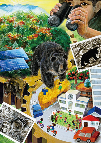 この本には筆者が撮ったさまざまな写真が載っていて、多方面からクマやその周りの環境、人間との関係性について詳しく書かれていました。自分なりにひとつずつ確かめ解き明かしてゆくこと、問題と向き合い続けることが大切だと感じました。私の作品では、クマの世界と人間の世界を大きな歯車に見立てて、問題を美化しすぎないように気をつけて、私たち人間の社会はどう変わってゆくべきか考えながら描きました。