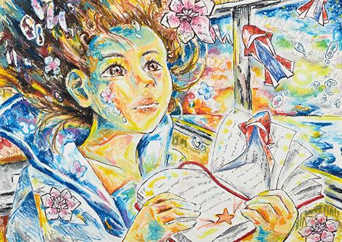 進路に悩み不安を抱える中学三年生のタコジローは、ある日、占い師のヒトデに出会います。本の世界に潜り、自分を見つめ直したタコジローは本当の自分を、進路を選んでいきます。他の誰でもない、自らが選んだ「自分だけの一冊」。そこで本が創る、鮮やかで深く深く続く自分の世界を、光る本とページでできた魚や花で表現しました。タコジローのように私も「自分だけの一冊」に出会い、進むべき道を見つけていきたいです。