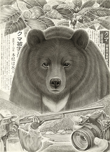 この絵は、クマと人間の関わりを表現した作品です。絵に実際の新聞記事を取り入れることで、私たちが普段目にする情報と、確かな命を持つクマの姿との対比を表しています。シンプルな白黒だからこそ、より静かな命の重みを伝えられるのではないかと考え、鉛筆画で描きました。